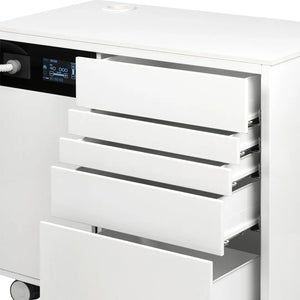 L'armoire dispose d'un compresseur silencieux et d'un moteur d'aspiration silencieux pour les pièces à main et la seringue 3 fonctions. Il y a un réservoir d'eau de 1 litre facilement accessible dans le placard. Vous n'avez besoin que d'une prise pour travailler avec la technologie la plus moderne et la plus innovante.
